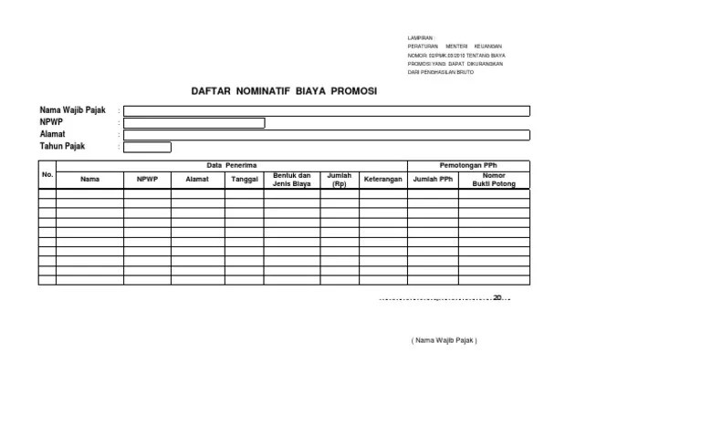 8, no, data penerima, pemotongan pph. • dalam hal biaya promosi tidak memenuhi ketentuan dalam . Biaya apa sajakah yg wjib dibutkan daftar nominatif? Format daftar nominatif biaya promosi adalah formulir yang digunakan oleh wajib pajak orang pribadi atau wajib pajak badan sebagai lampiran . Menurut uu pph, biaya promosi dapat menjadi pengurang penghasilan bruto selama.